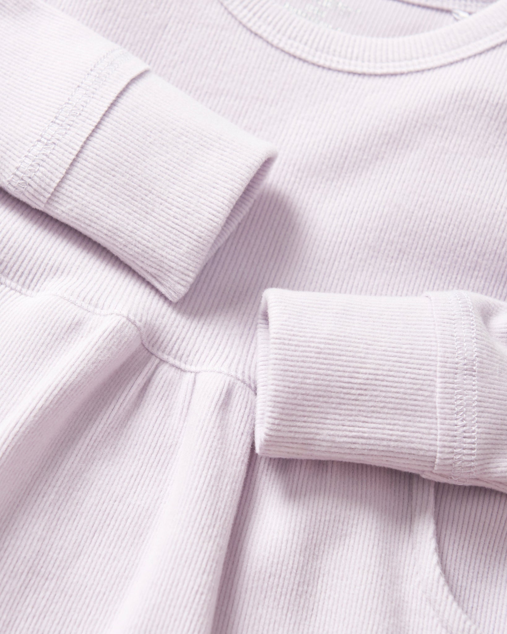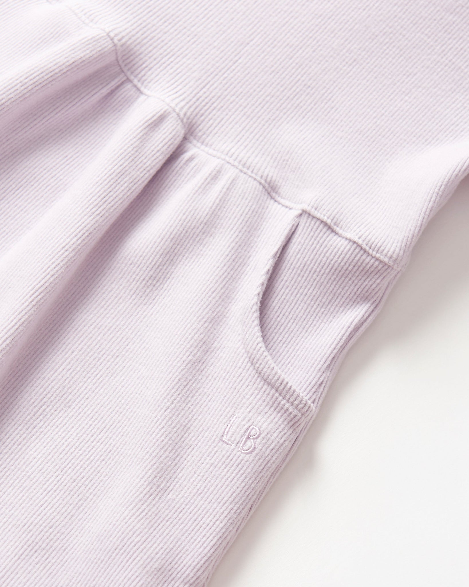 Soft, simple, and made for movement. The brushed ribbed fabric and ribbed trim details give this dress a cozy, elevated feel. Finished with functional front pockets and a soft Lilac hue that adds the perfect pop of color for everyday wear.