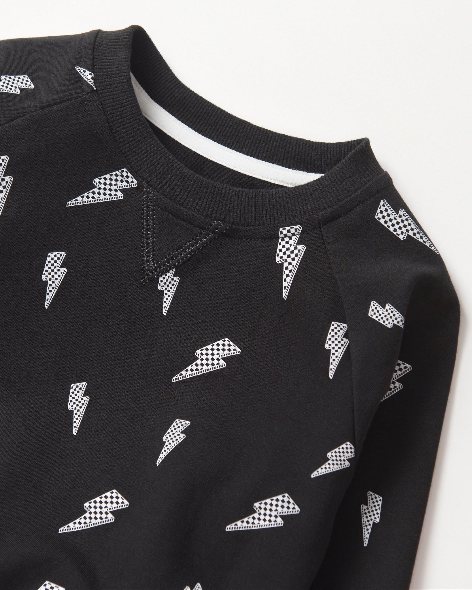 A classic pullover with a little extra fun. Featuring our fun lightning bolt print, this piece is designed to keep your little one comfy through every adventure. Made with a ribbed neckline, cuffs, and hem for a snug fit, plus rollable cinched sleeves and side slits for easy movement. Finished with our signature embroidered “LB” logo — everyday comfort with a bold twist.
