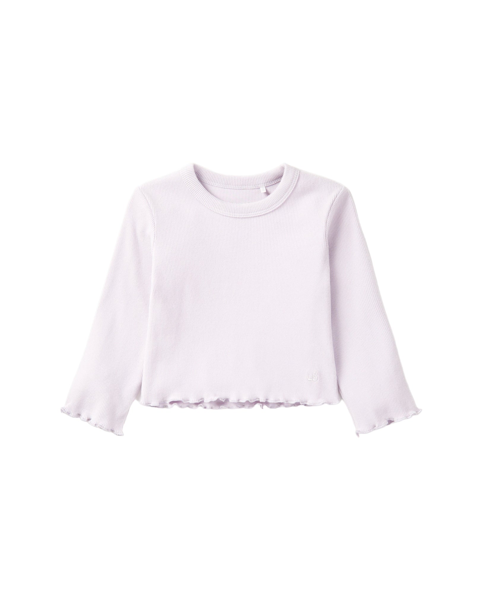 An easy everyday essential with a subtle twist. Made from our soft brushed ribbed fabric in a soft Lilac hue, this long sleeve tee features delicate lettuce trim on the cuffs and hem for a clean, elevated look. Finished with a ribbed neckline and our signature embroidered “LB” logo—simple, comfy, and made to mix and match.